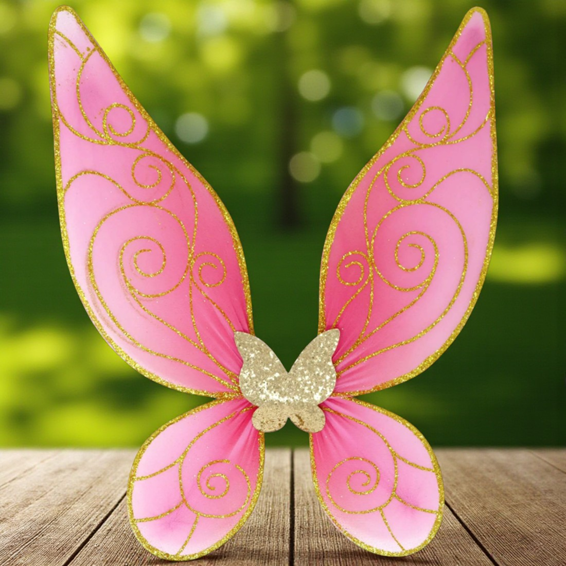 - Pink-coloured wings. Glitter gold details