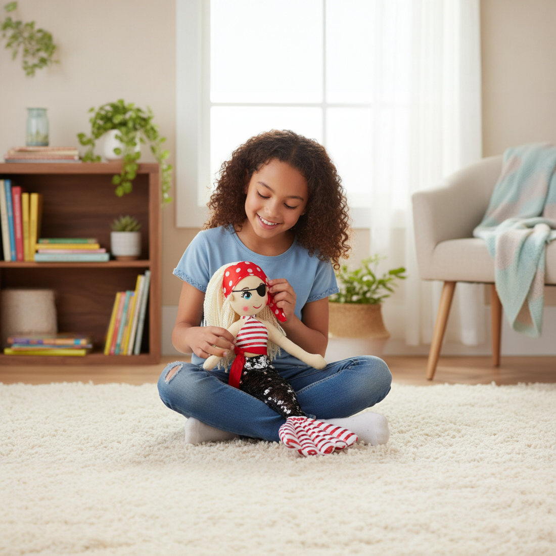 Meet Christine, the gorgeous pirate mermaid doll with a black and silver sequin skirt and a cheeky white and red striped bodice and sporting a mysterious black eye patch, Cotton Candy Christine is ready for high-seas adventures. This flip sequined mermaid doll transforms from pirate to princess with a magical shimmer, making her the perfect companion for imaginative play and swashbuckling storytelling.