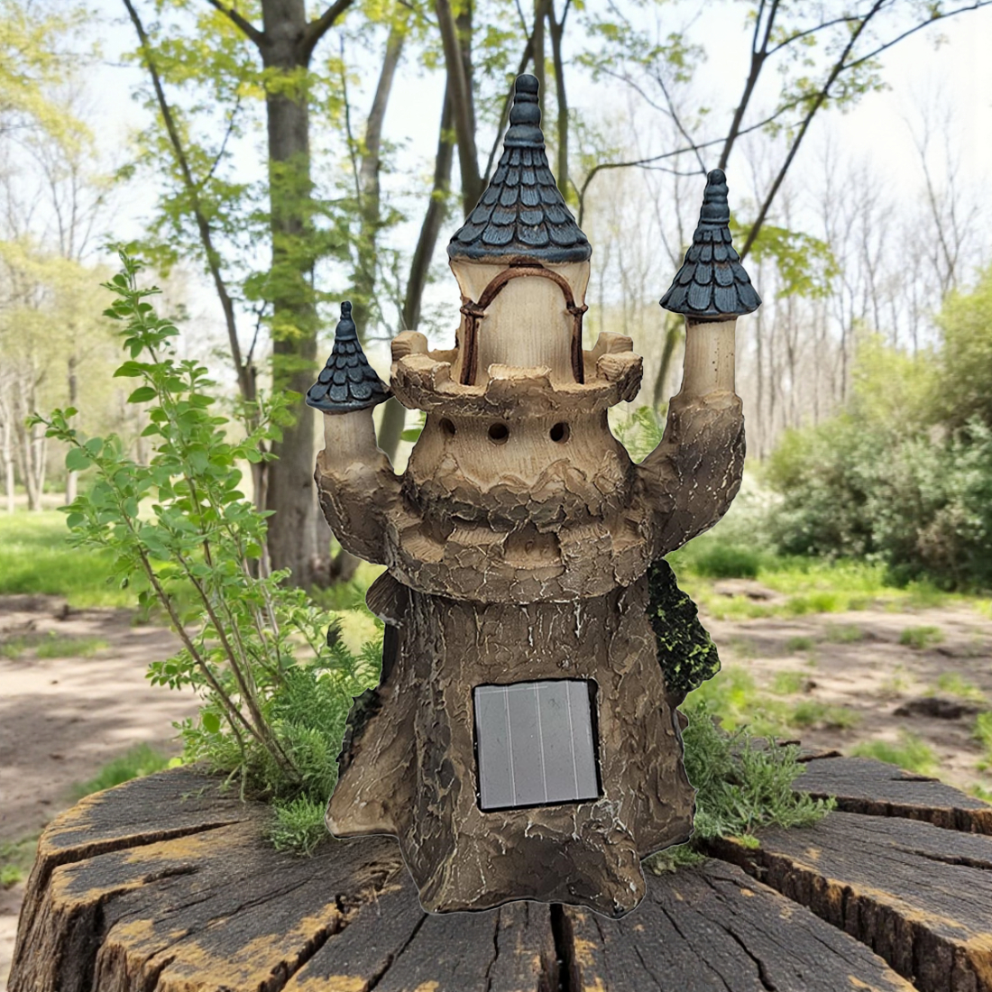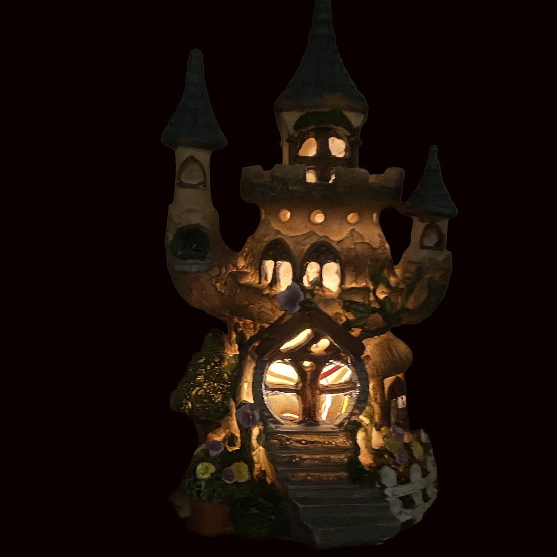 Step into a storybook dream with this small enchanting fairy castle, perfect for your fairy garden! Featuring a charming front staircase, delicate turrets, and lovely flower accents, this 21cm tall solar-powered castle adds whimsical magic to any outdoor space.
