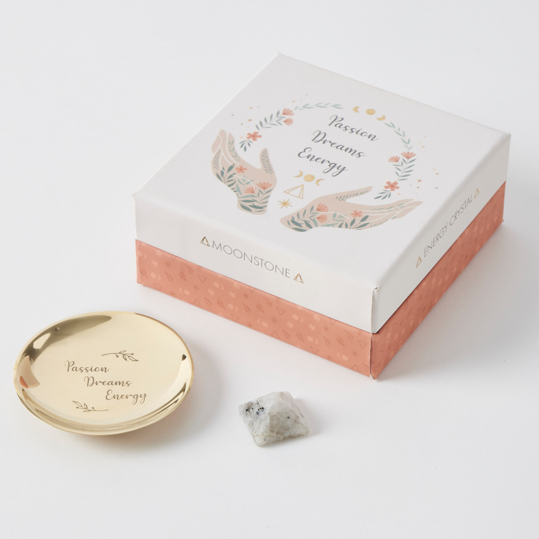 The Moonstone is said to promote Passion, Dreams, and Energy. Crafted into a pyramid shape, this crystal is designed to transmit your intentions to the universe. Comes with a laser-etched brass plate to carry this semi-precious stone. Artfully hand-cut, each stone exudes one-of-a-kind beauty. The perfect gift set for those in touch with their spiritual side.