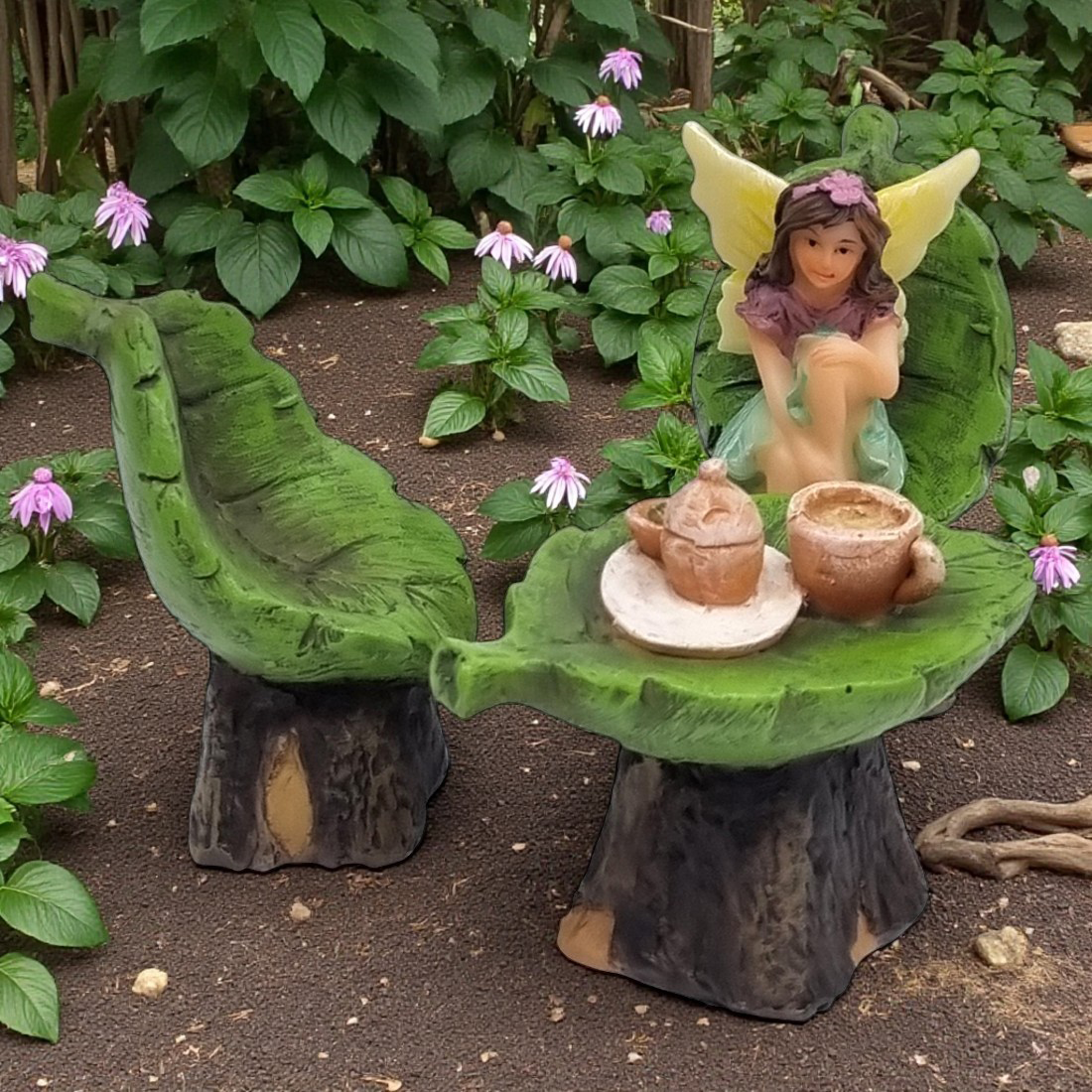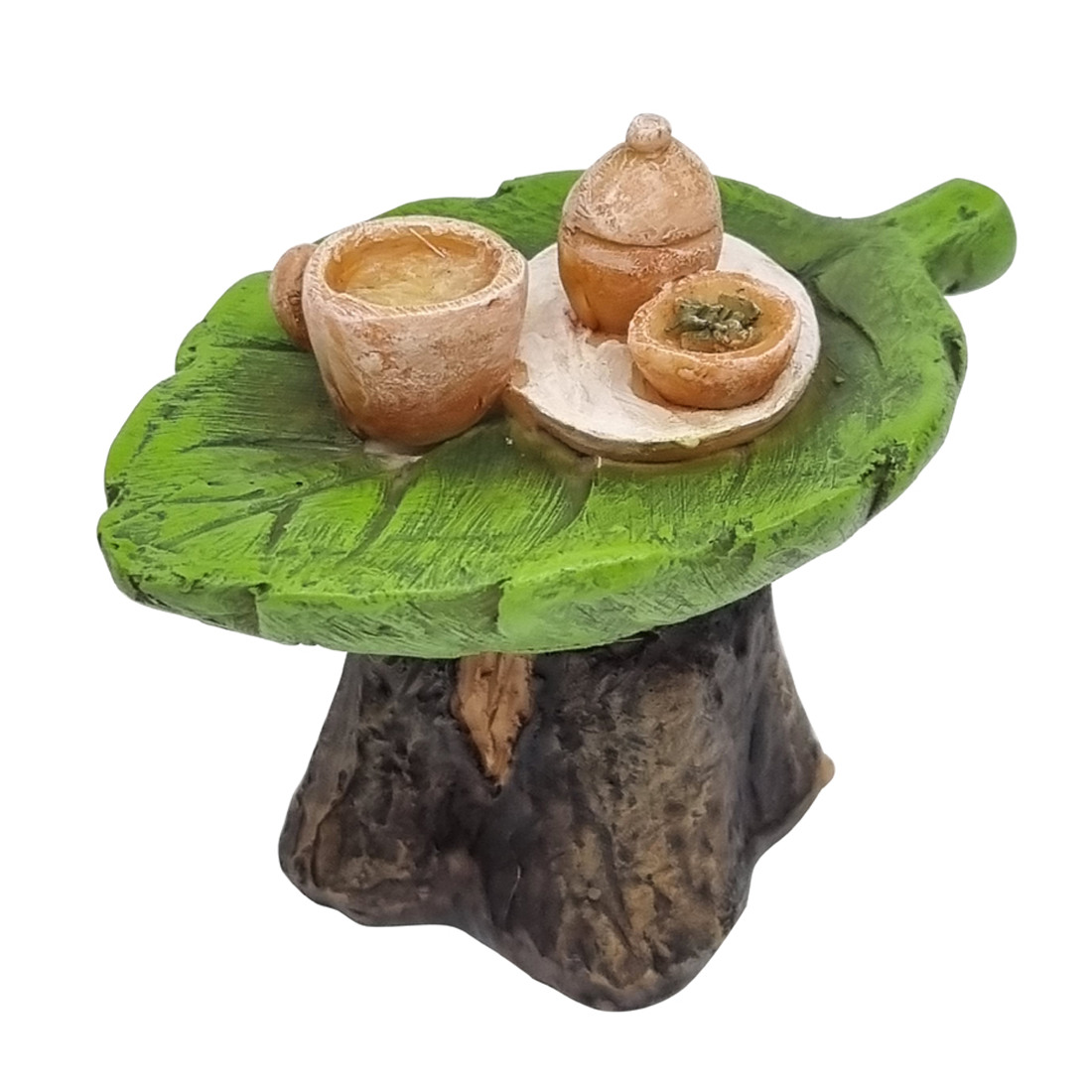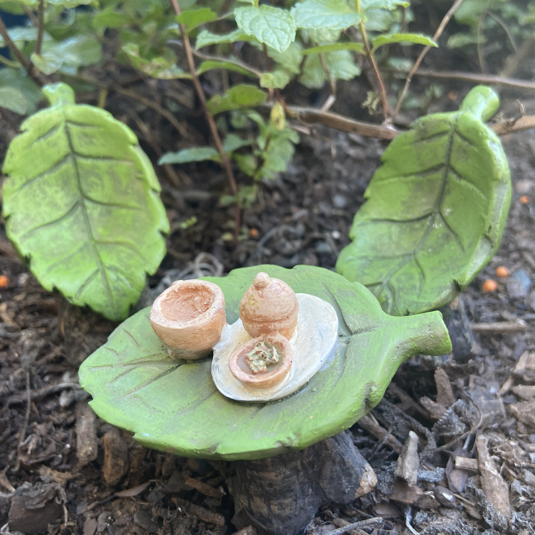 Create a magical world in your backyard with the Fairy Garden Leaf Furniture 3 Piece Set. Crafted with intricate detail, this set features a leaf shaped table, two chairs, and a fixed tea set on the table - the perfect set up for a tea party with forest friends. Bring a touch of nature to your garden with this beautiful leaf-inspired furniture set.