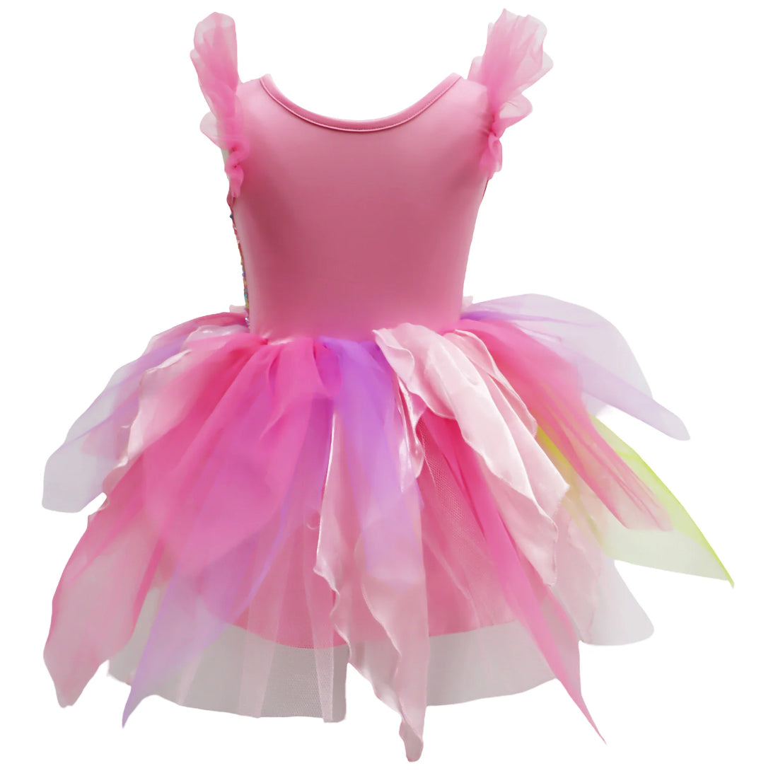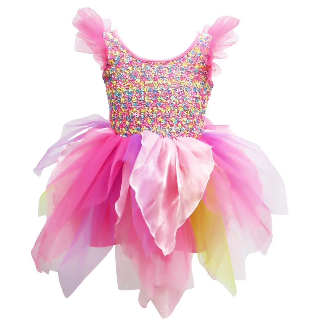 Step into a world of sparkle and imagination with this enchanting Fairy Magic Pink Party Dress. Featuring a pastel rainbow sequin bodice, soft ruffle tulle sleeves, and a whimsical multi-layered skirt of fabric petals, it’s designed to capture the magic of make-believe and celebration. Lightweight yet durable, the dress ensures comfort with its stretch bodice while shimmering details add charm for birthdays, parties, dress-ups, or playful fairy adventures. A beautiful keepsake piece that will delight any little dreamer.