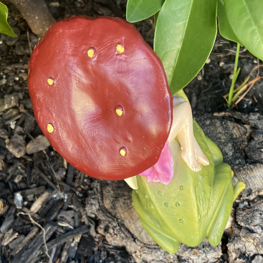 Perched atop her cheerful frog companion , this delightful 15cm fairy figurine dressed in a pretty pink fairy sundress clutches a mushroom sun parasol, the perfect whimsical touch for any magical collection. A charming piece that brings enchantment and playful wonder to shelves and gardens alike.