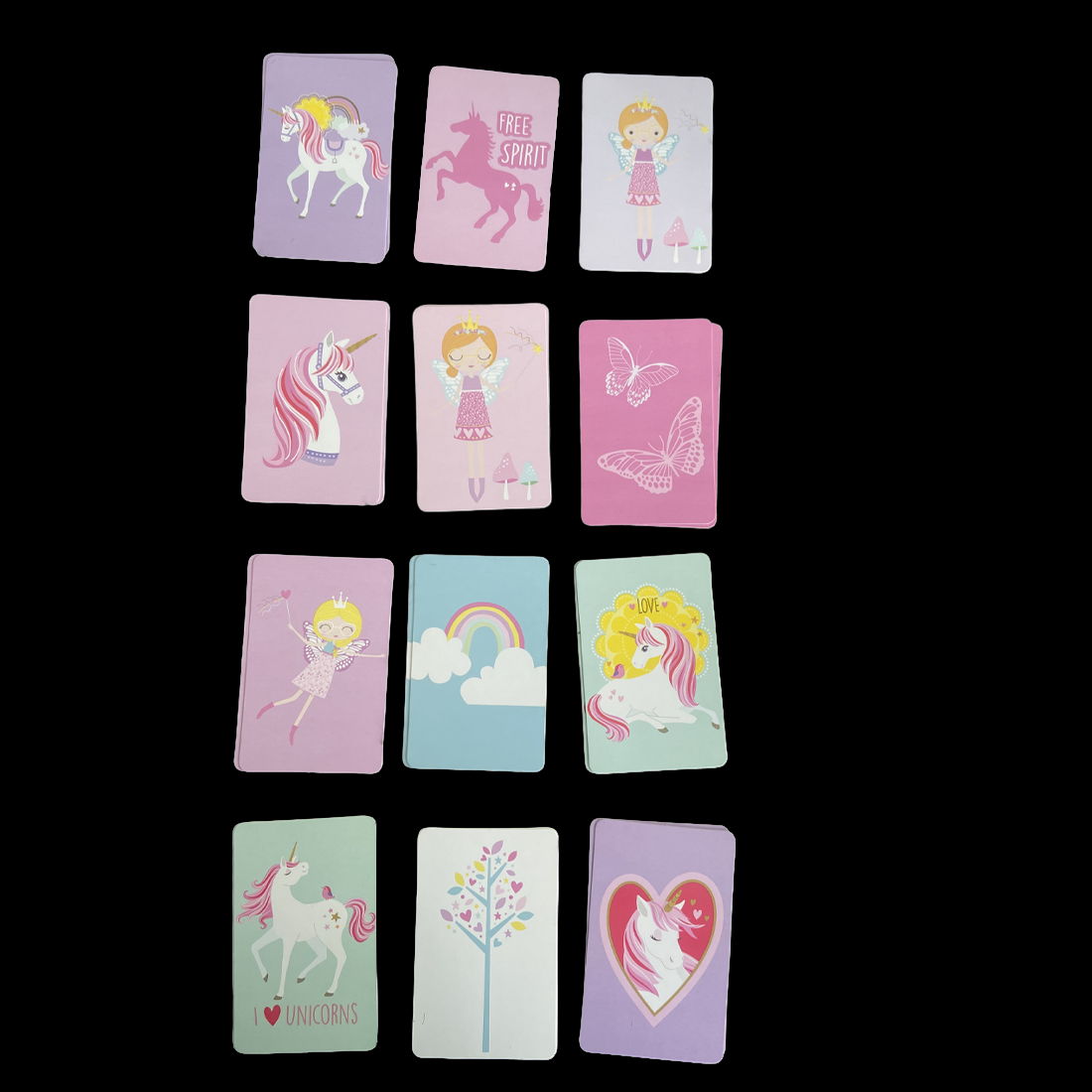 Enjoy a playful memory card game featuring 24 fairy and unicorn themed designs. These delightful cards are great as party favours or to fill party bags, making birthday celebrations even more magical. Ideal for any princess, fairy, or unicorn-themed party.