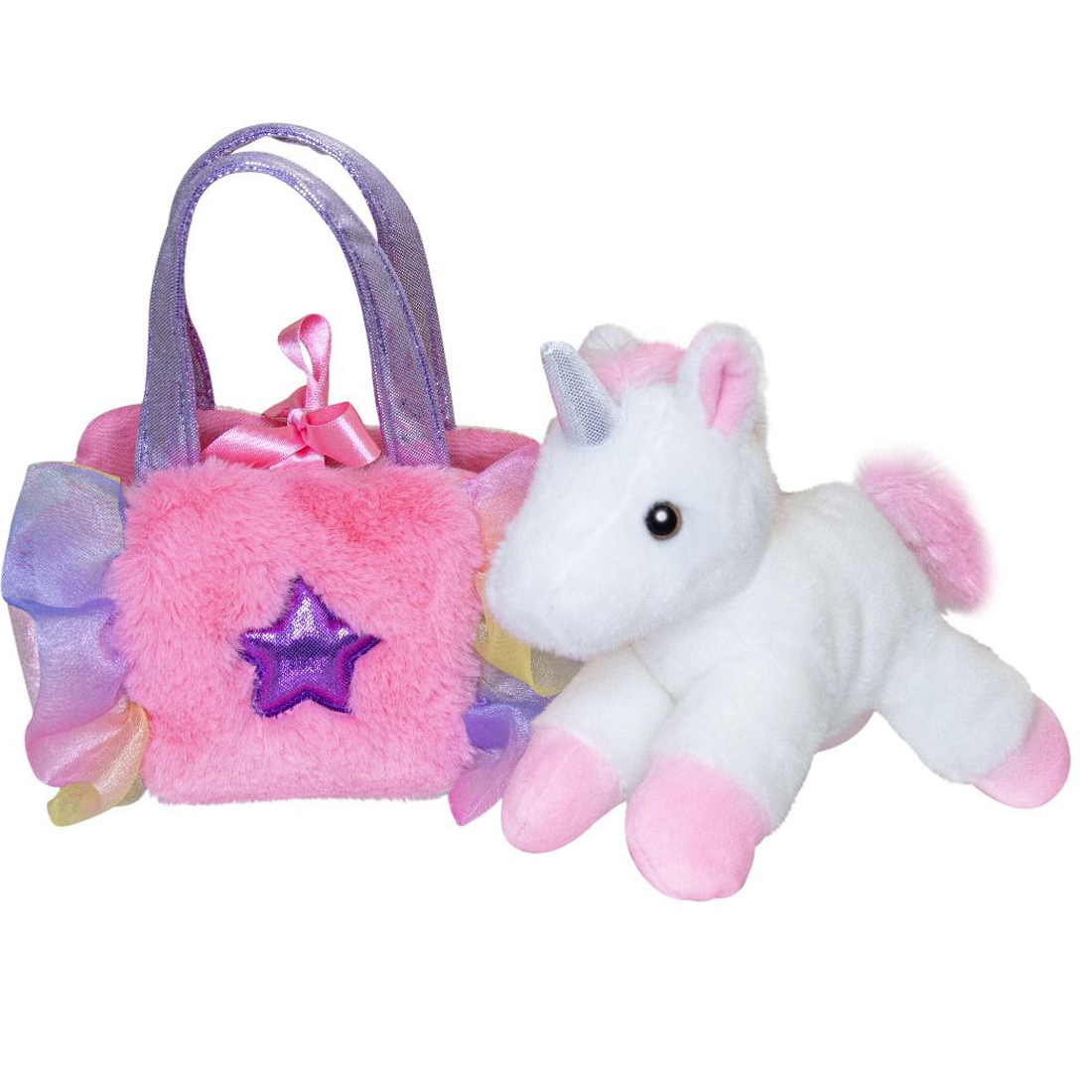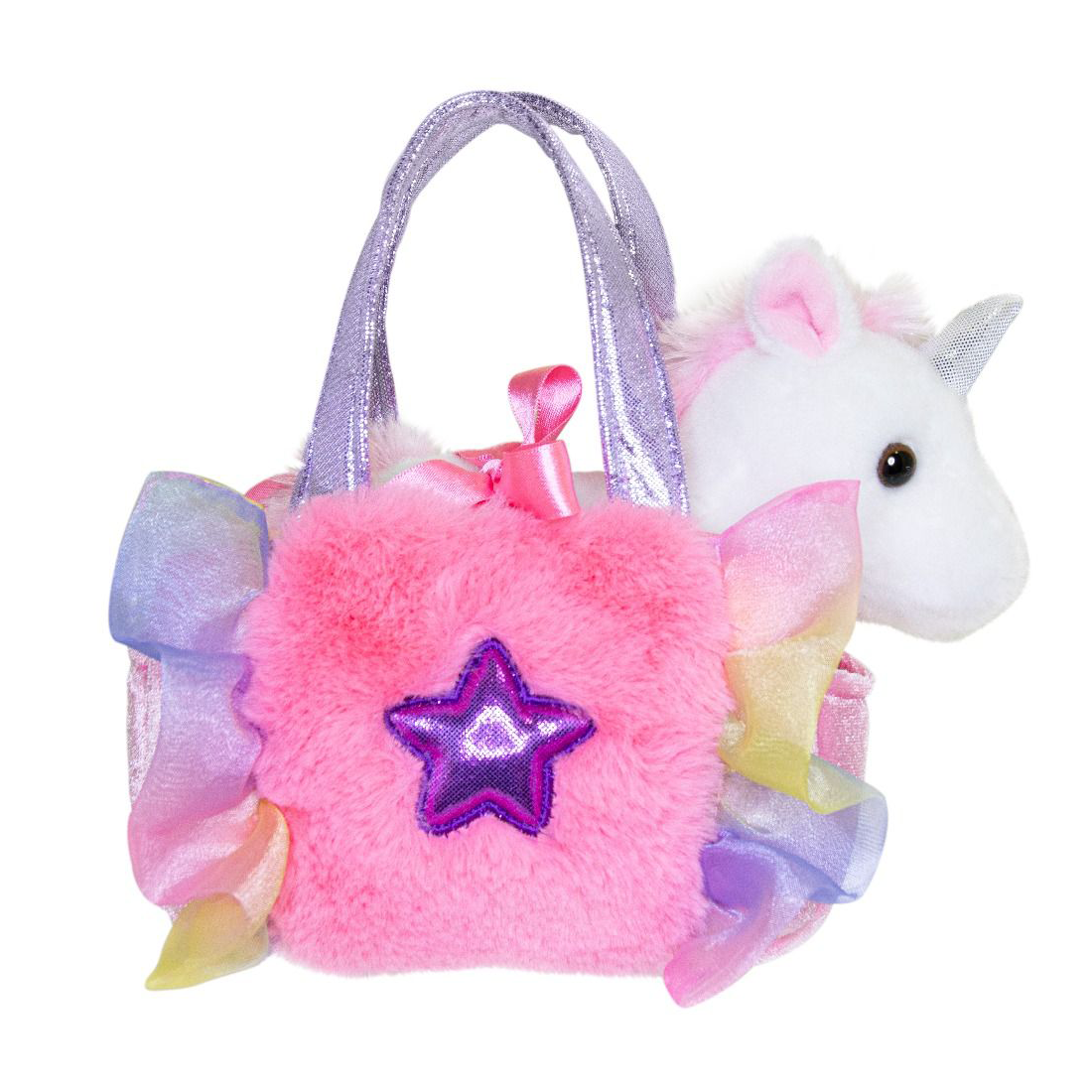This adorable Plushie unicorn sits so comfortably in a gorgeous pink velour bag with a metallic purple handle. Small and compact, your little one can carry their new friend wherever they go and pull out at any time for a cuddle!