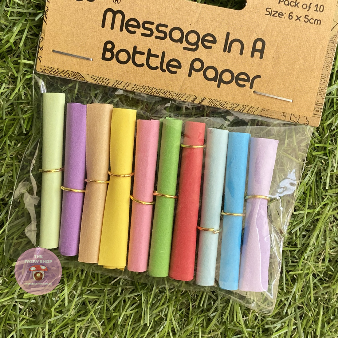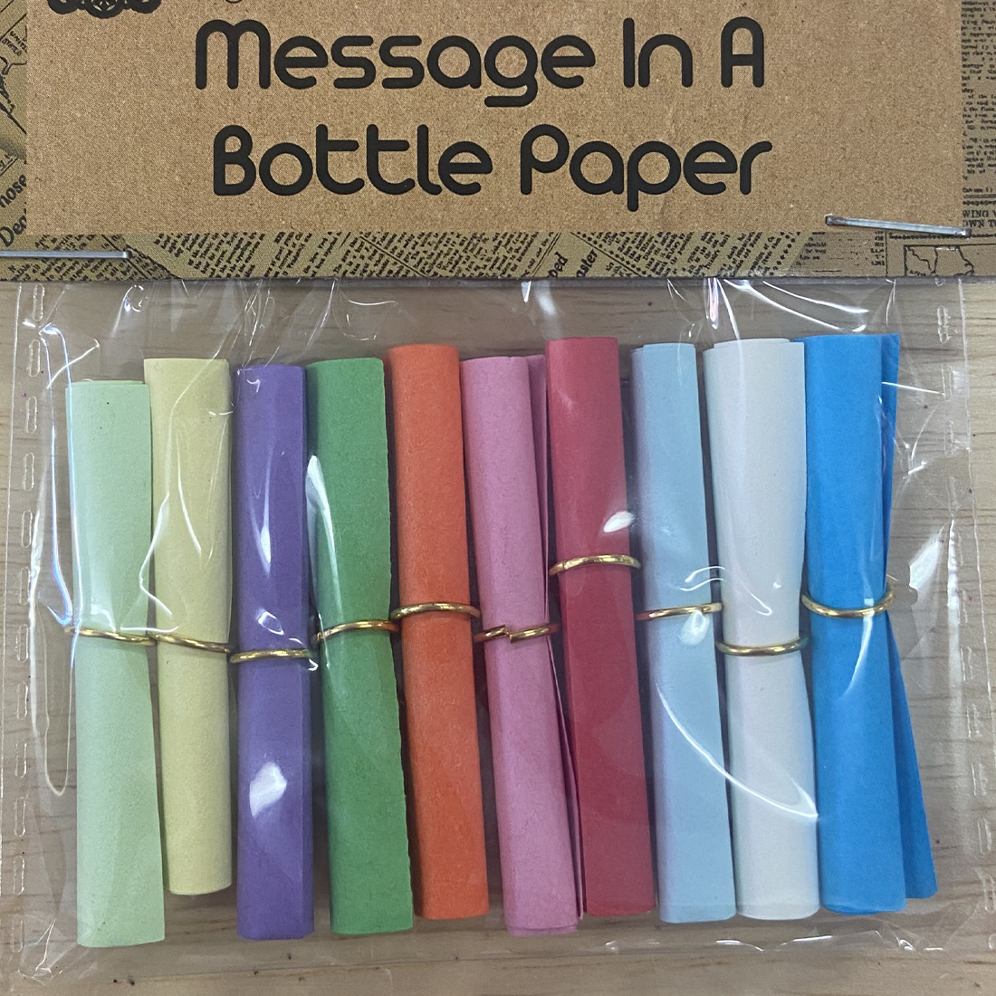 Unleash your inner creativity and send a personalized message with our Message in a Bottle Paper! Each blank scroll comes in a variety of colours and is tied with a shiny gold wire for a touch of elegance.