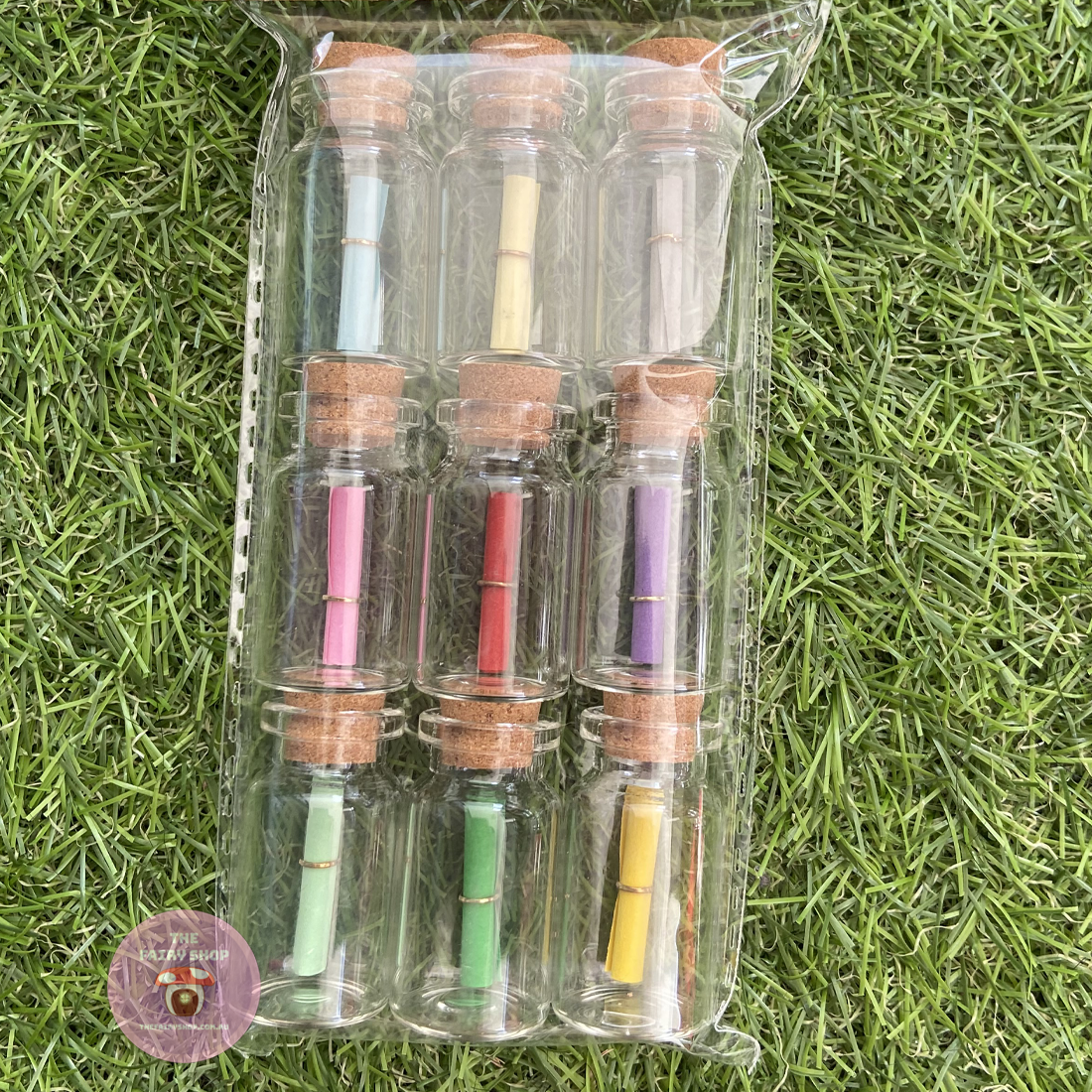 Experience fairy enchantment with our set of nine glass bottles, each containing a different blank scroll waiting for your words! Perfect for party giveaways – just pop the cork, scribble a wish or message for the fairies, and reseal. Sprinkle in some glitter if you're feeling extra magical, or keep them simple and charming. Let the fairy mischief begin!