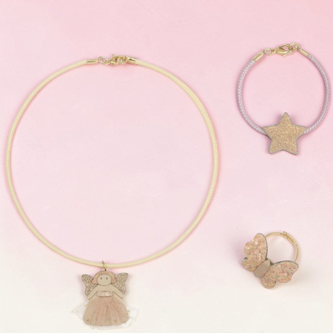 - Set includes one necklace, bracelet and a ring featuring a sweet fairy with tulle skirt, a sparkling butterfly and twinkling star all crafted from soft suedette, glitter and metallic fabrics