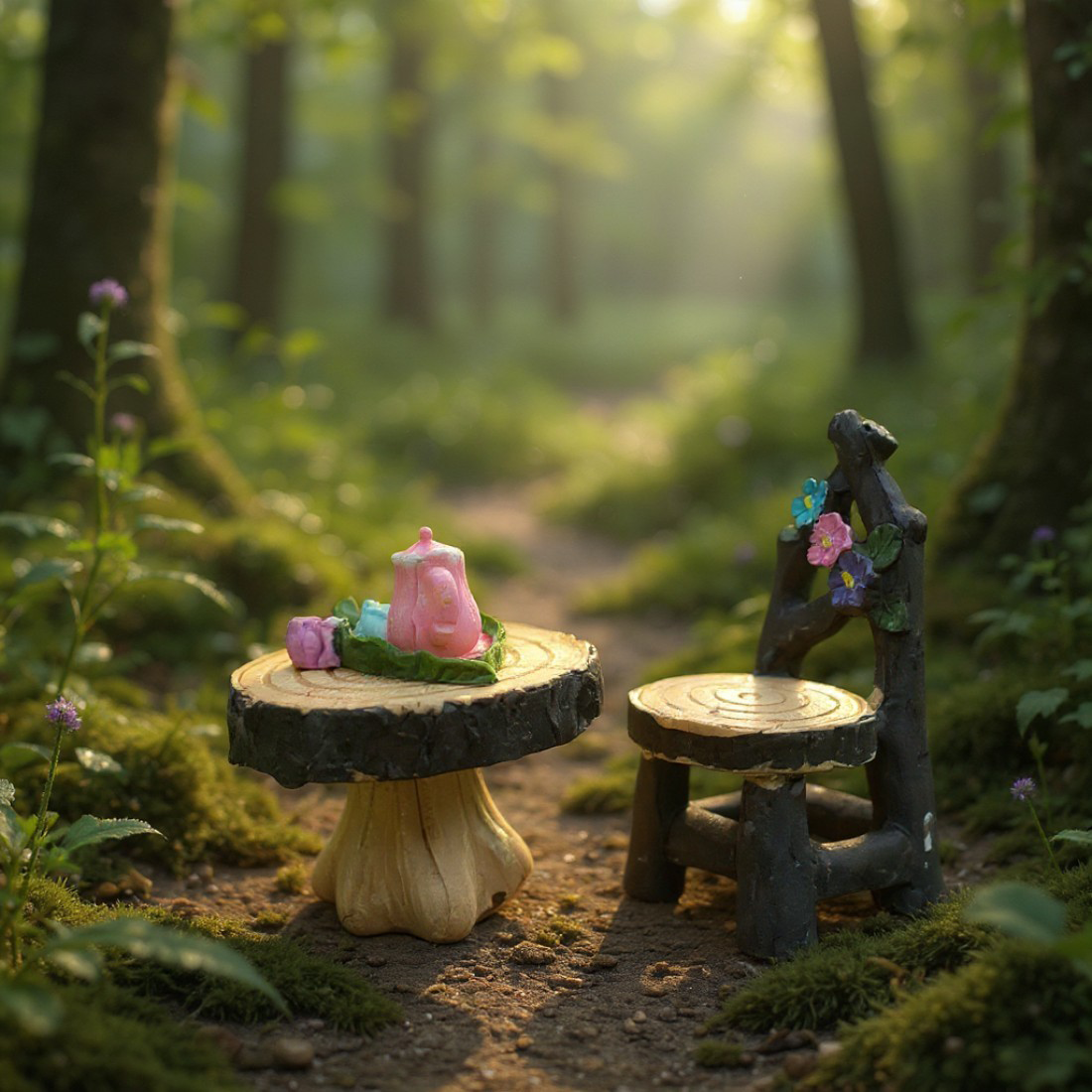 This tiny fairy garden table and chair set is absolutely charming! The table features a cute teapot on a leaf that’s permanently attached. It includes both a table and a matching chair, perfect for magical play.