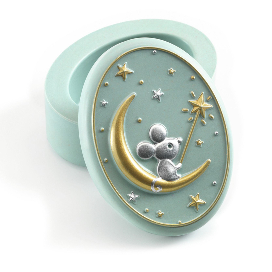 A special and pretty box to keep teeth safe while waiting for the tooth fairy to collect. The design features gold and silver metallic paint and a silicone stopper for the lid to adhere and remain closed.