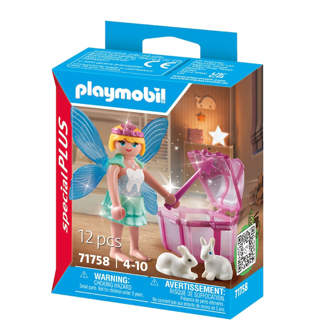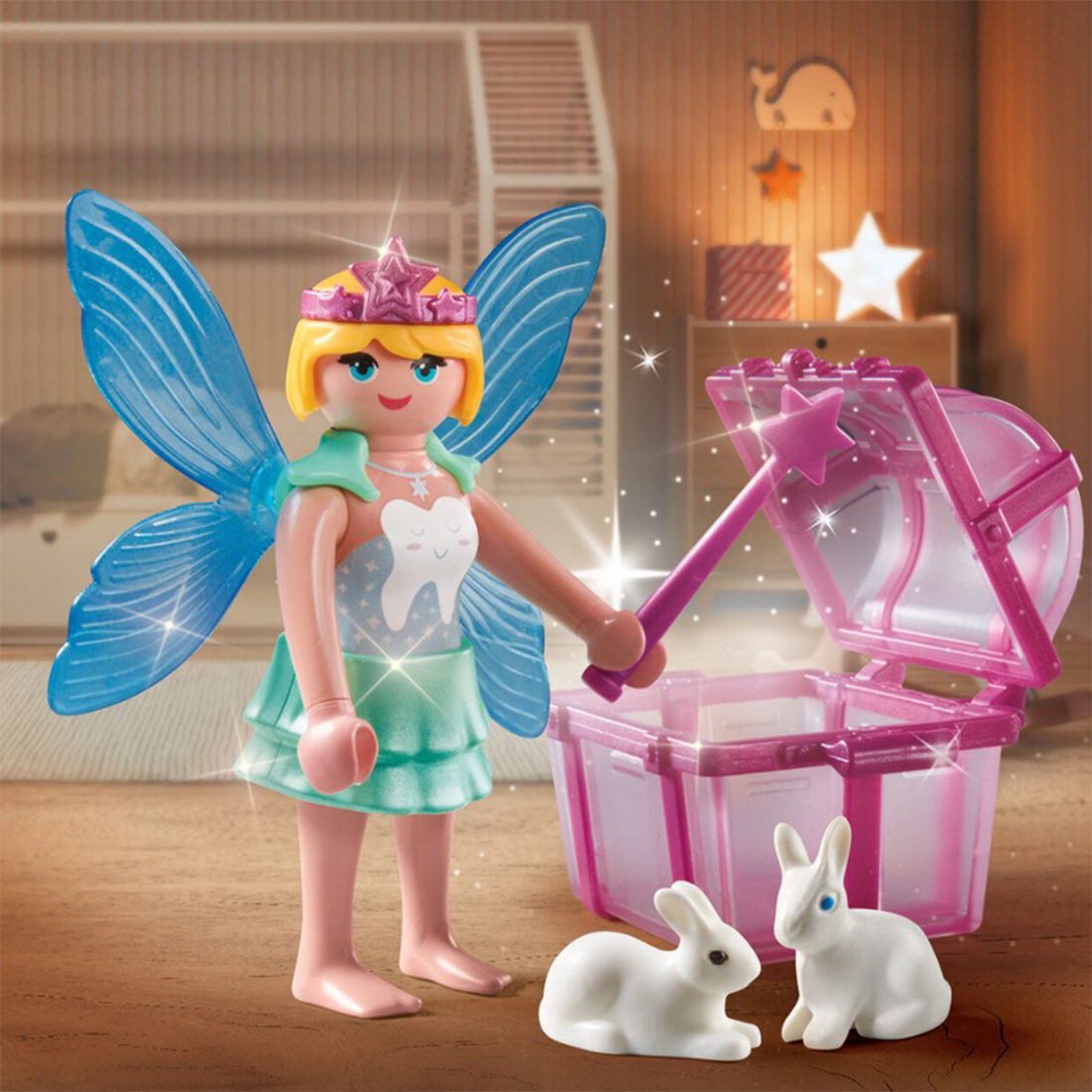How gorgeous is this Playmobil special plus tooth fairy with her magic wand!, treasure chest, and two rabbits. On her nightly visit, the friendly fairy is accompanied by two cute companions. The small chest provides ample space for storing your little ones teeth. Dressed in her enchanting outfit with a detachable skirt, sparkling wings, wand, the Tooth Fairy makes every visit a magical moment. Two adorable rabbit companions add an extra touch of charm to the Tooth Fairy's adventures. The treasure chest is the perfect place to safely keep little teeth, making this set not just fun but practical, too. Perfect for creating special memories, this PLAYMOBIL set turns every tooth-losing moment into a magical occasion! Contains 12 pieces, warning choking hazard not for children under 3 years.