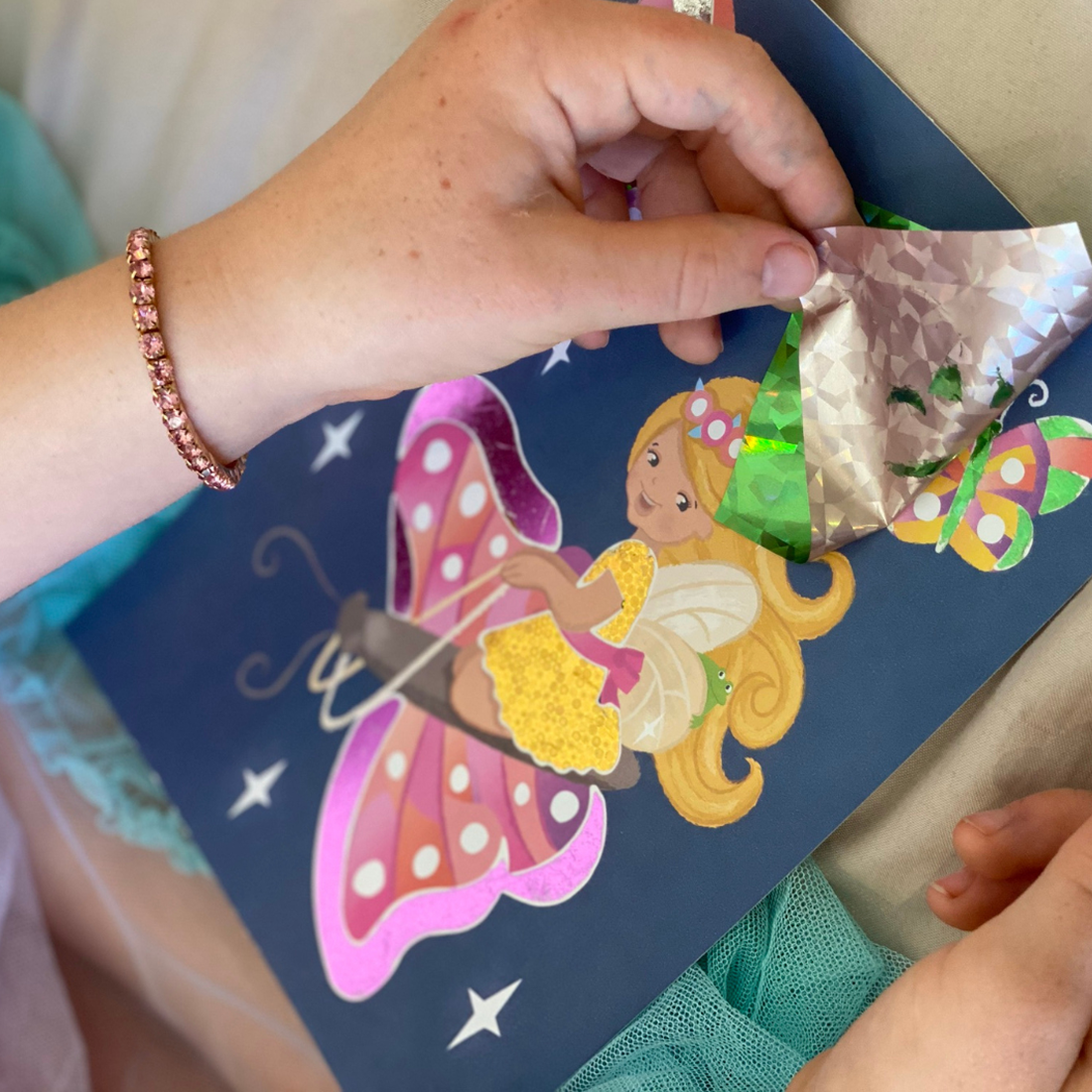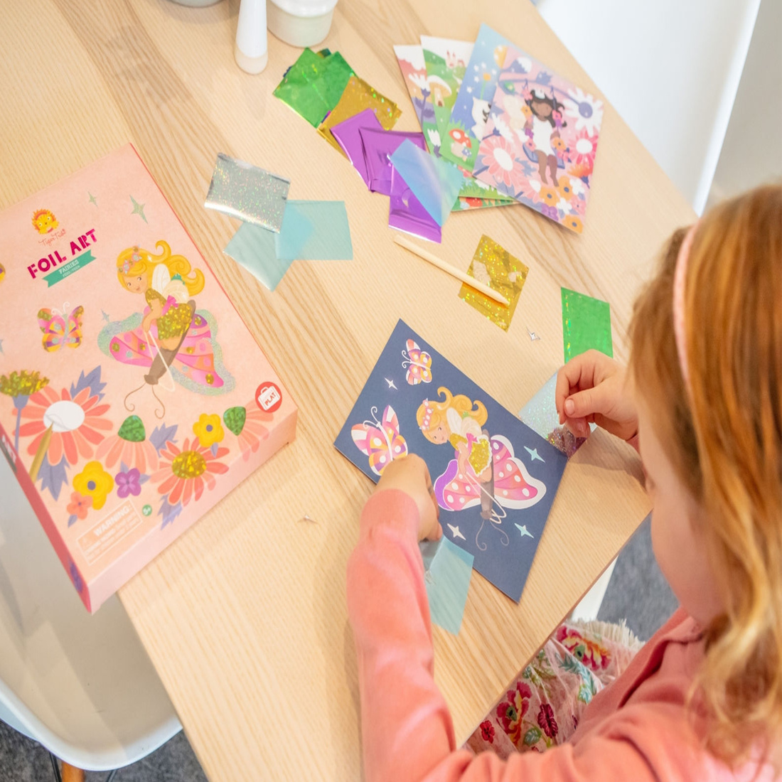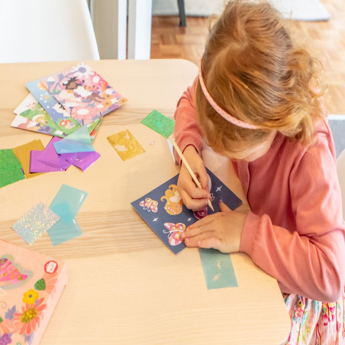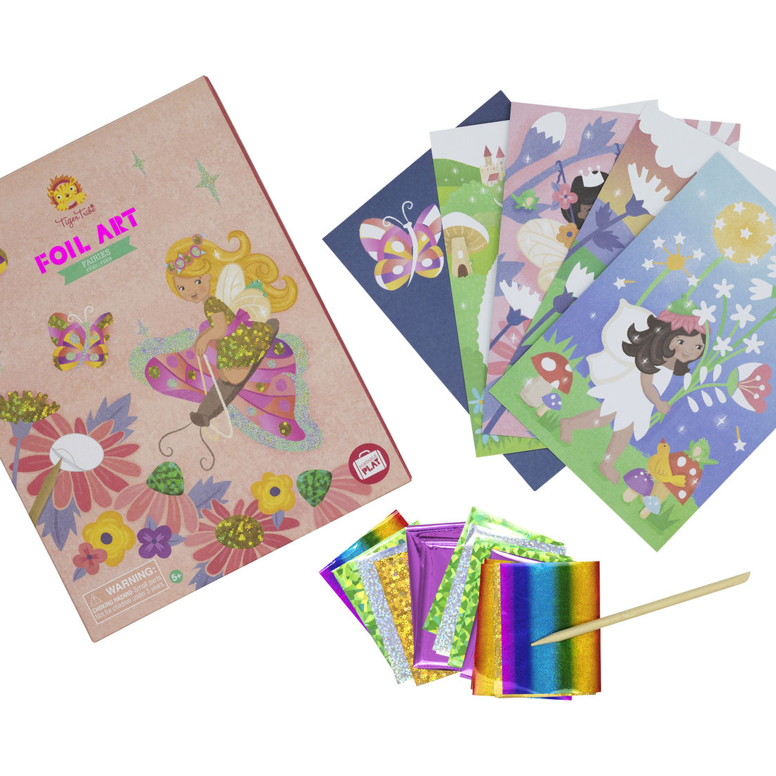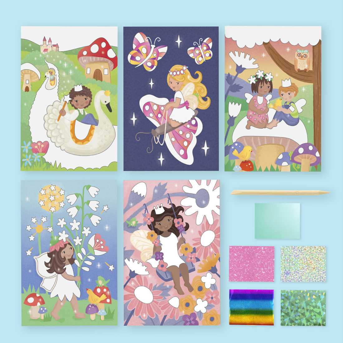 Butterfly wings, flower petals and fairy crowns are all waiting to be brought alive with a sparkling rub of holographic foil! Simply select a colour illustrated fairy card and use the enclosed wooden lifter to peel sections off the picture, revealing adhesive sections. Grab a shimmering foil sheet, rub the foil onto the sticky area and voila! A beautiful shiny artwork.