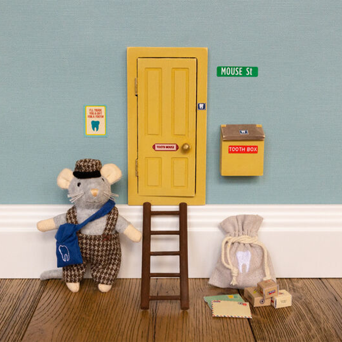 Make losing a tooth a magical event with this Tooth Fairy Mouse Gift Set. It features a cuddly Tooth Mouse plush with a tiny removable blue tooth bag, a special tooth gift bag, and a charming mouse door complete with a ladder and mailbox. Plus, there are pop-out decoration sheets you can personalise the door, ladder, and mailbox. Why not paint the door, mail box and ladder or keep them plain! *Please note, paint is not included.