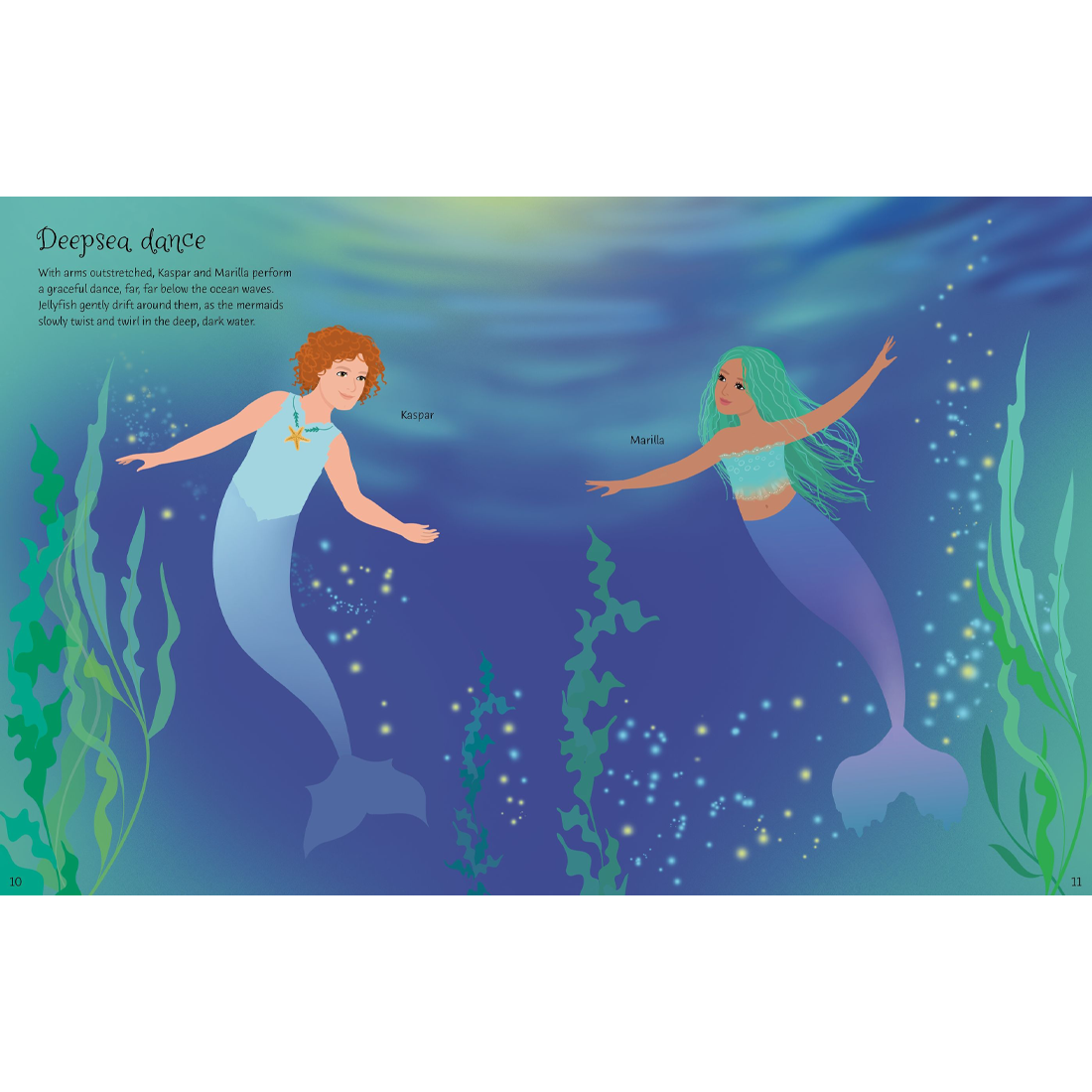 Swim with mermaids as they explore a mysterious cave, find sunken treasure, meet a mer-prince and play with creatures in their mystical underwater world. Add the stickers to dress the mermaids and bring the colourful scenes to life.
